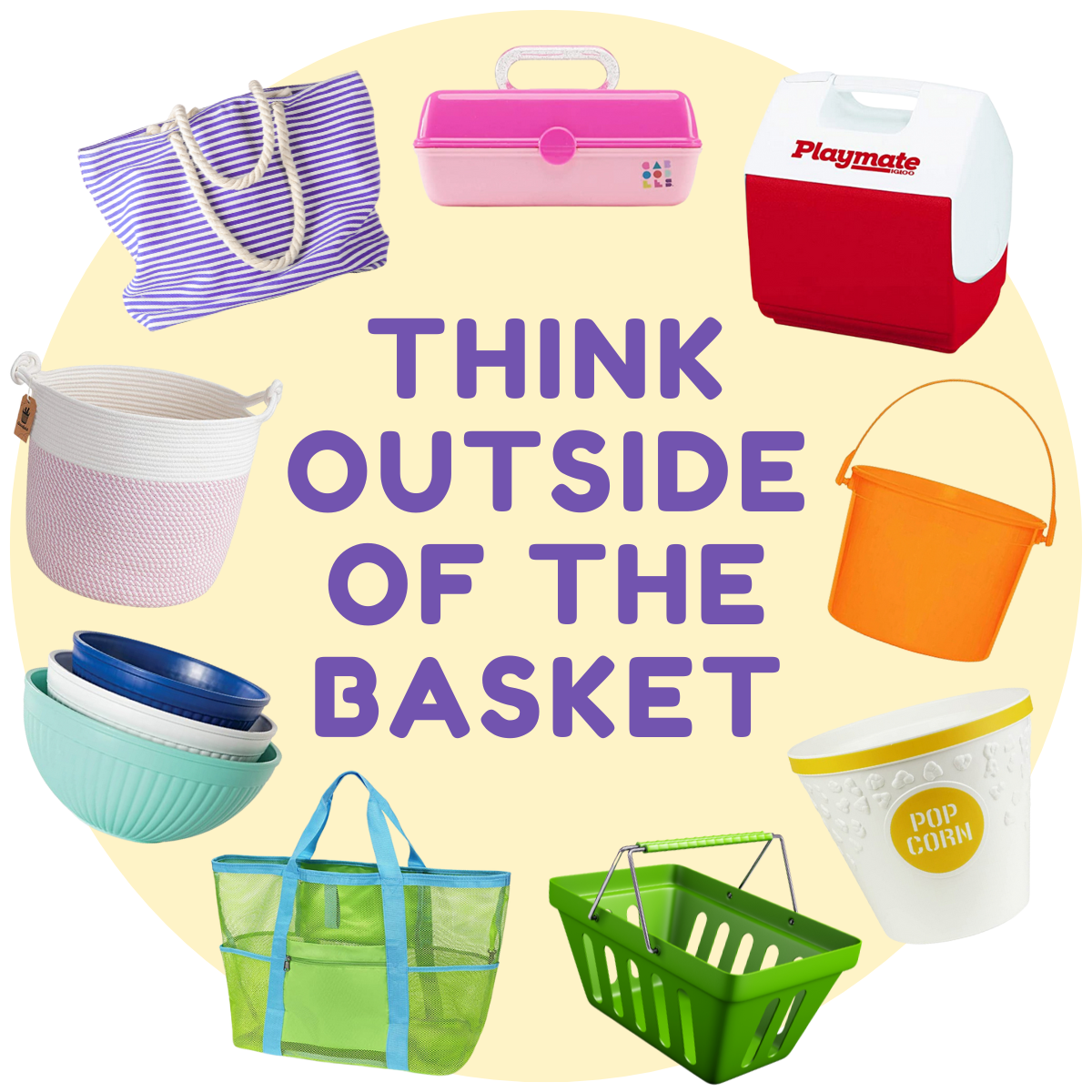 A-tisket, a-tasket, think outside the basket! Your basket donation doesn’t have to be in a traditional “basket”. Think bags, buckets, bins, bowls, coolers, colanders, caboodles, hampers, small toolboxes…ALL sorts of containers can be used to hold your goodies! Consider something that fits within your theme and see if you can use it as your basket!